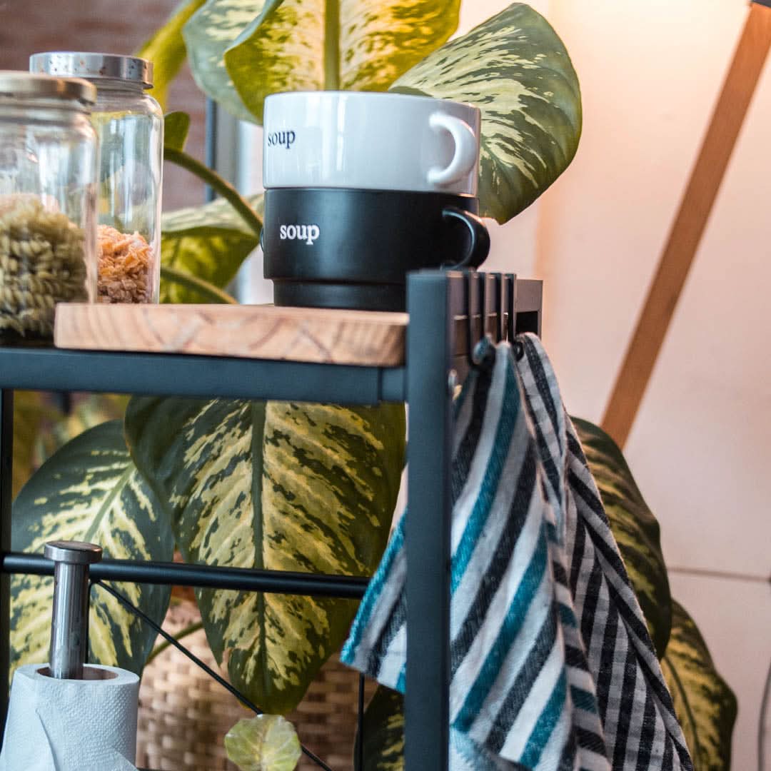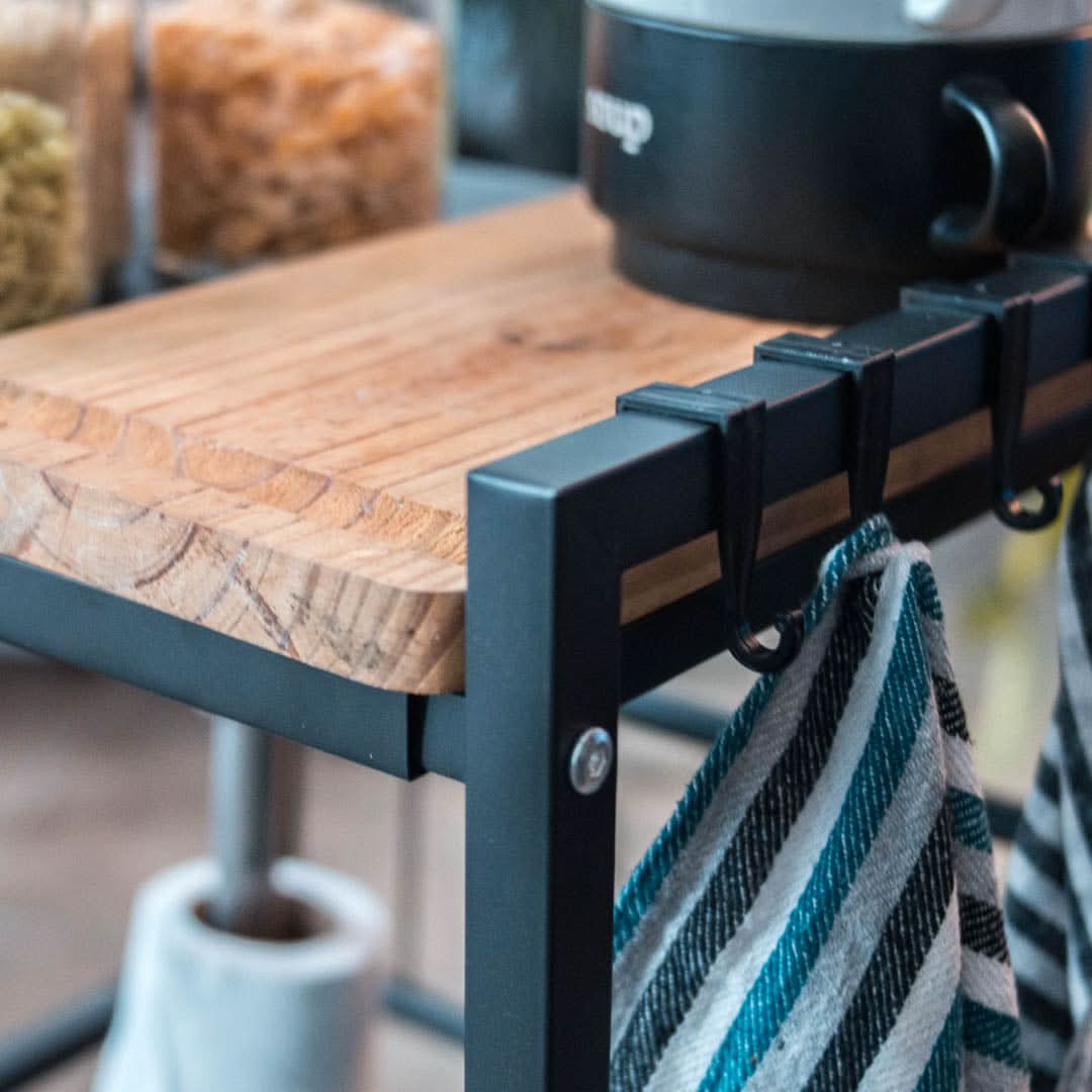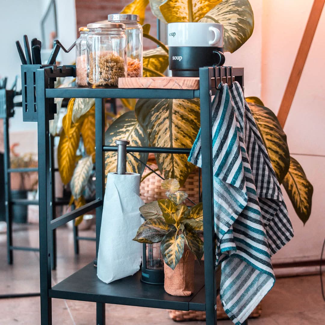Diseñado específicamente para acomodar el microondas, este organizador cuenta con dos estantes que ofrecen espacio adicional para almacenar utensilios de cocina, platos, condimentos u otros accesorios.